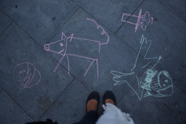 Malá H. sa pri nás hrá s drevenou vážkou a oco jej kreslí obrázky na chodník.
