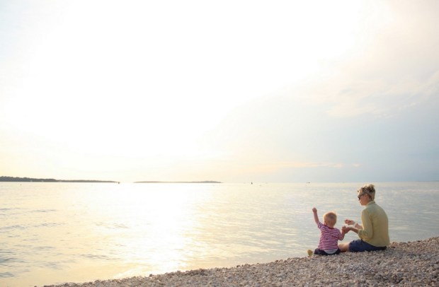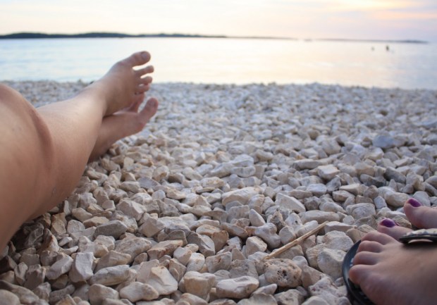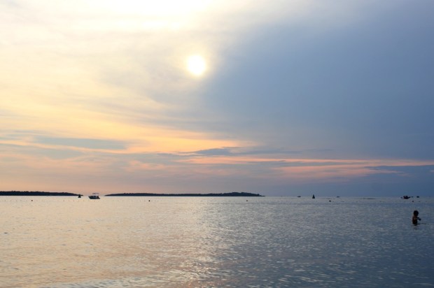 Po precestovanej noci aj doobedí, po hľadaní ubytovania v najjužnejších pobrežných mestách Istrie, sadli sme si na kamienkovú pláž a pozorovali pomalé zapadajúce slnko nad morom. Bola to spokojnosť, bol to pohľad, na ktorý sme čakali, bol to neletný chlad, ktorý nastal po západe, bol to studený vánok, čo nám chladil pokožku počas prvej prechádzky večerným mestom Fažana.